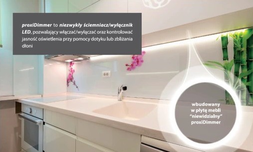 proxiDimmer to niezwykły ściemniacz/wyłącznik LED, pozwalający włączać/wyłączać oraz kontrolować jasność oświetlenia przy pomocy dotyku lub zbliżania dłoni